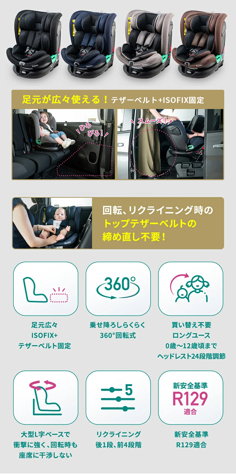 ・ISOFIX+テザーベルトで足下広々 ・360°回転で乗せ降ろしラクラク ・大きなL字台座(リバウンドバー)で衝撃に強く、回転の際も座席に干渉しない ・回転時、テザーベルトの締め直し不要!邪魔にならずストレスフリー ・お子さまを360°守るワイドサポート ・赤ちゃんを包み込むインナーサポート ・R129適合 ・シートカバーを取り外し、水洗い可能 ・簡単ヘッドレスト・肩ベルト調節