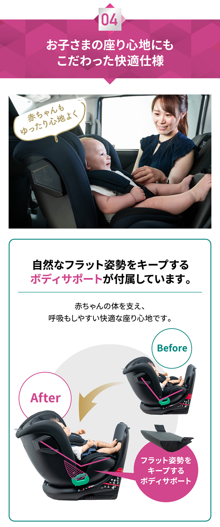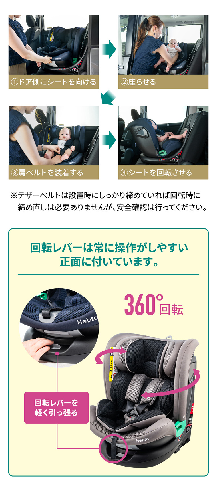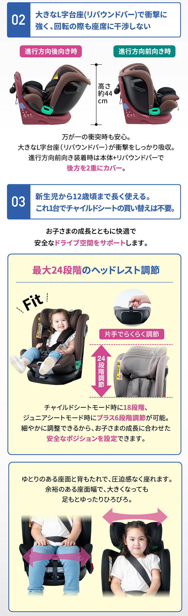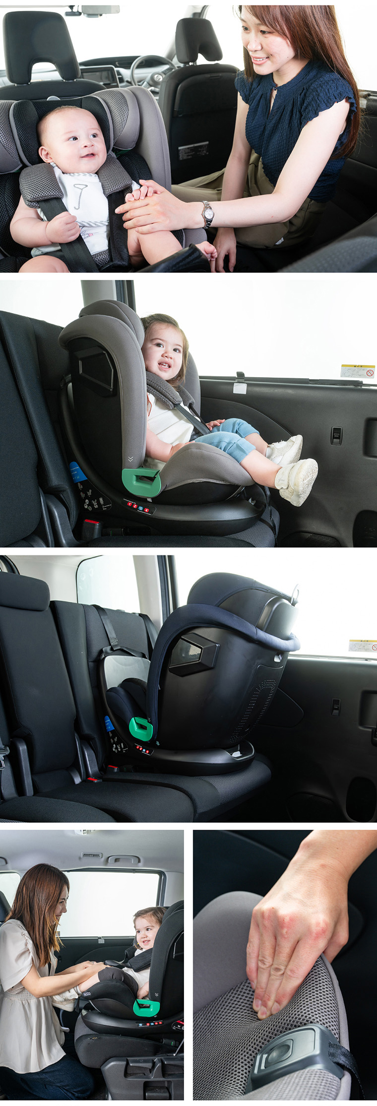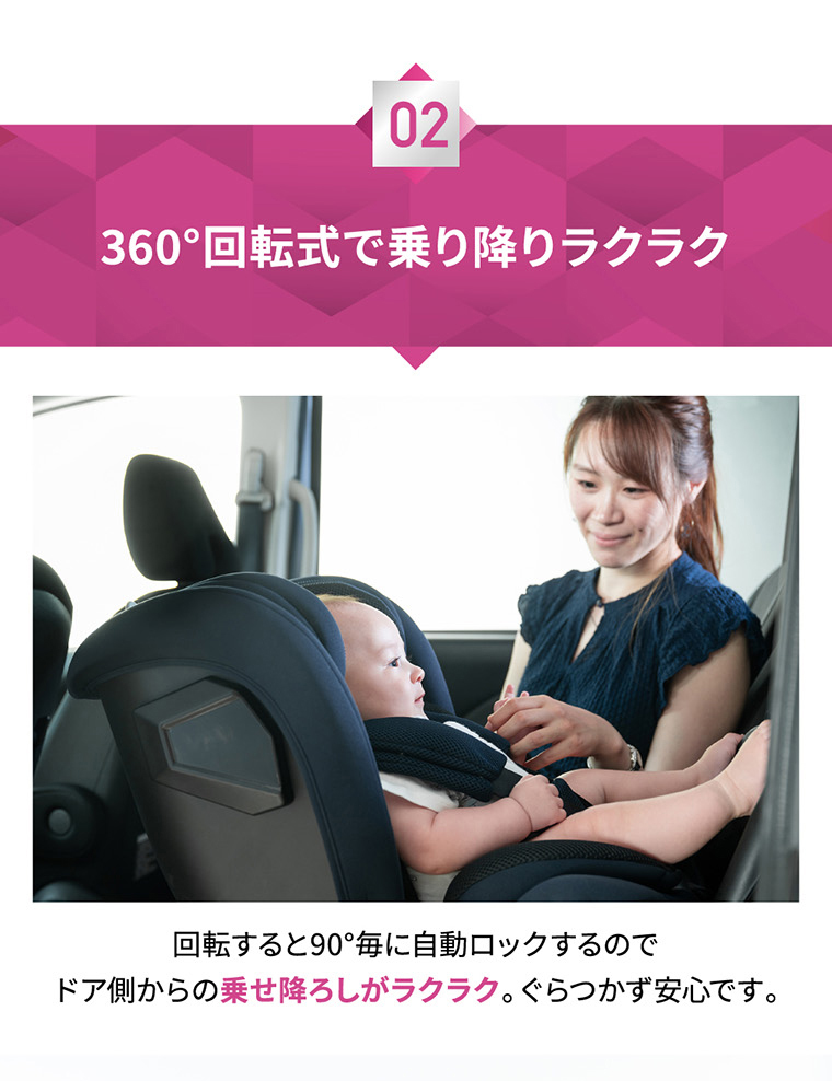・ISOFIX+テザーベルトで足下広々 ・360°回転で乗せ降ろしラクラク ・大きなL字台座(リバウンドバー)で衝撃に強く、回転の際も座席に干渉しない ・回転時、テザーベルトの締め直し不要!邪魔にならずストレスフリー ・お子さまを360°守るワイドサポート ・赤ちゃんを包み込むインナーサポート ・R129適合 ・シートカバーを取り外し、水洗い可能 ・簡単ヘッドレスト・肩ベルト調節