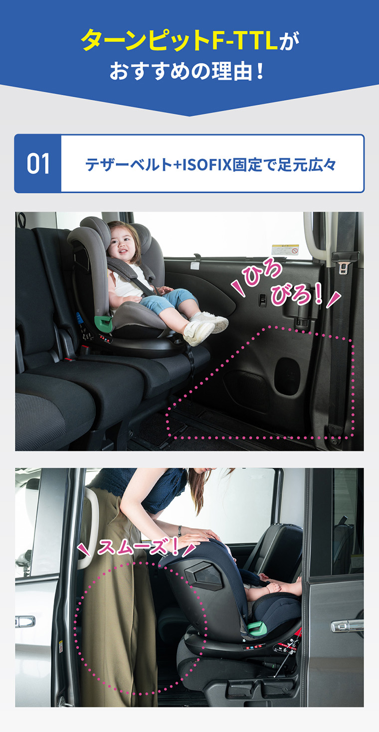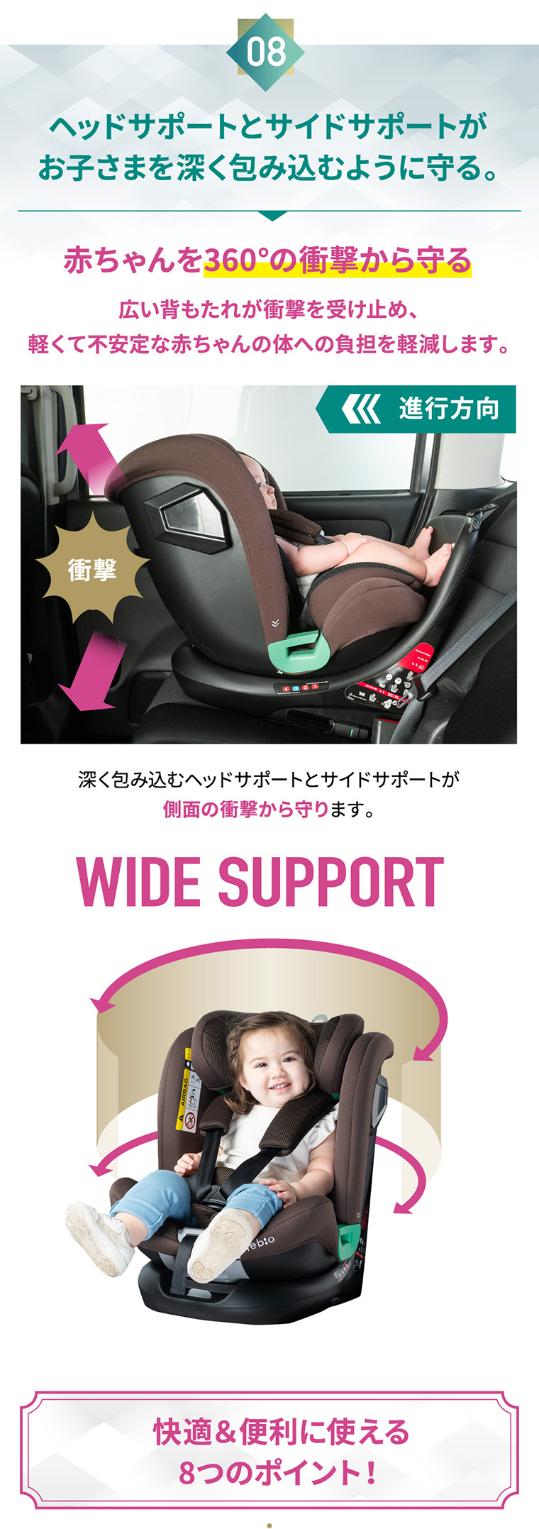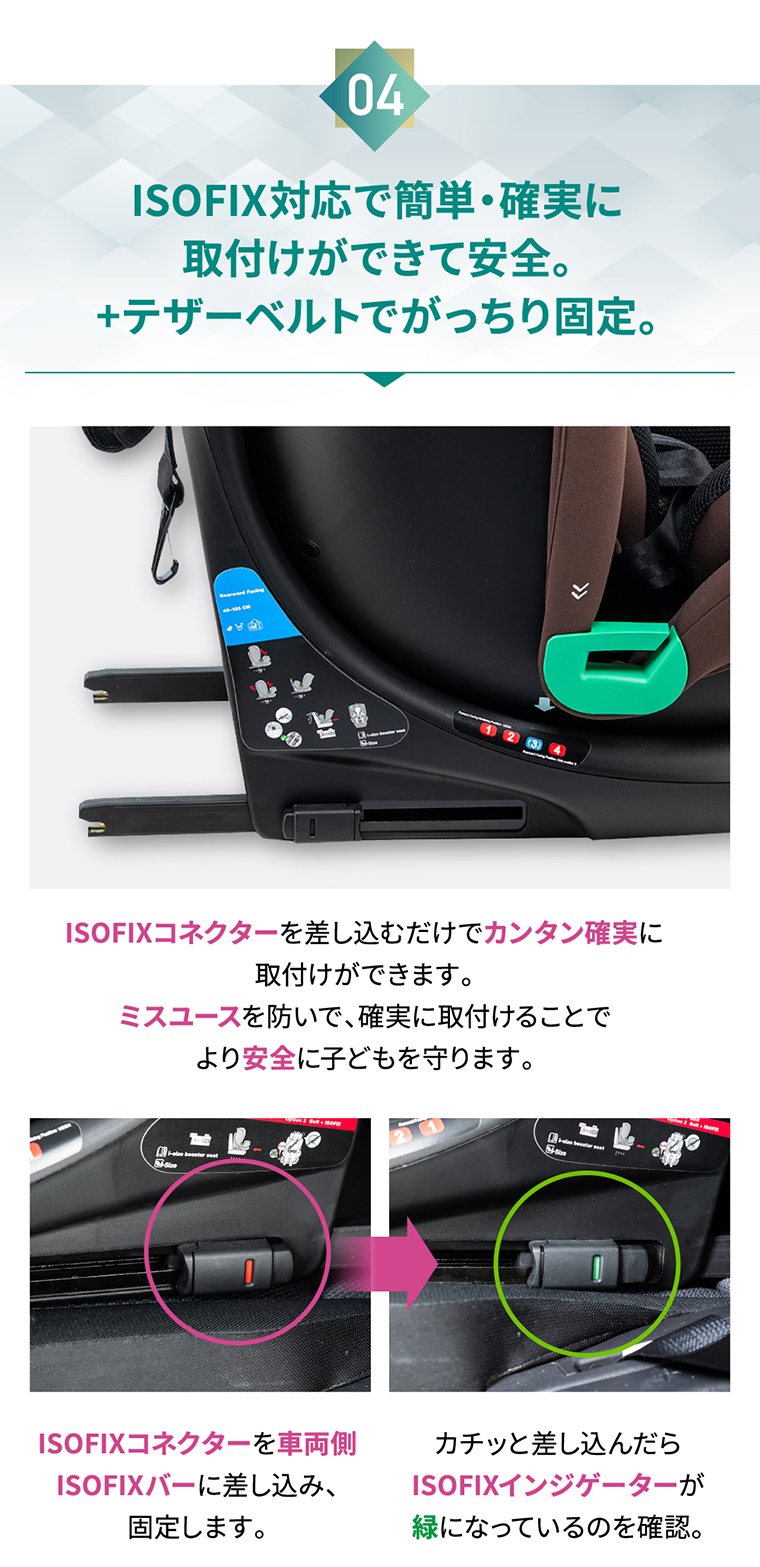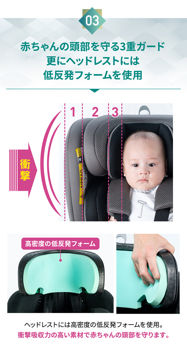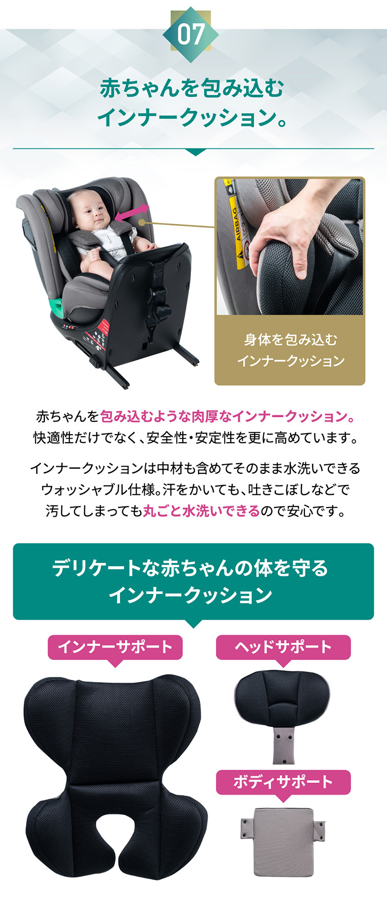 ・ISOFIX+テザーベルトで足下広々 ・360°回転で乗せ降ろしラクラク ・大きなL字台座(リバウンドバー)で衝撃に強く、回転の際も座席に干渉しない ・回転時、テザーベルトの締め直し不要!邪魔にならずストレスフリー ・お子さまを360°守るワイドサポート ・赤ちゃんを包み込むインナーサポート ・R129適合 ・シートカバーを取り外し、水洗い可能 ・簡単ヘッドレスト・肩ベルト調節