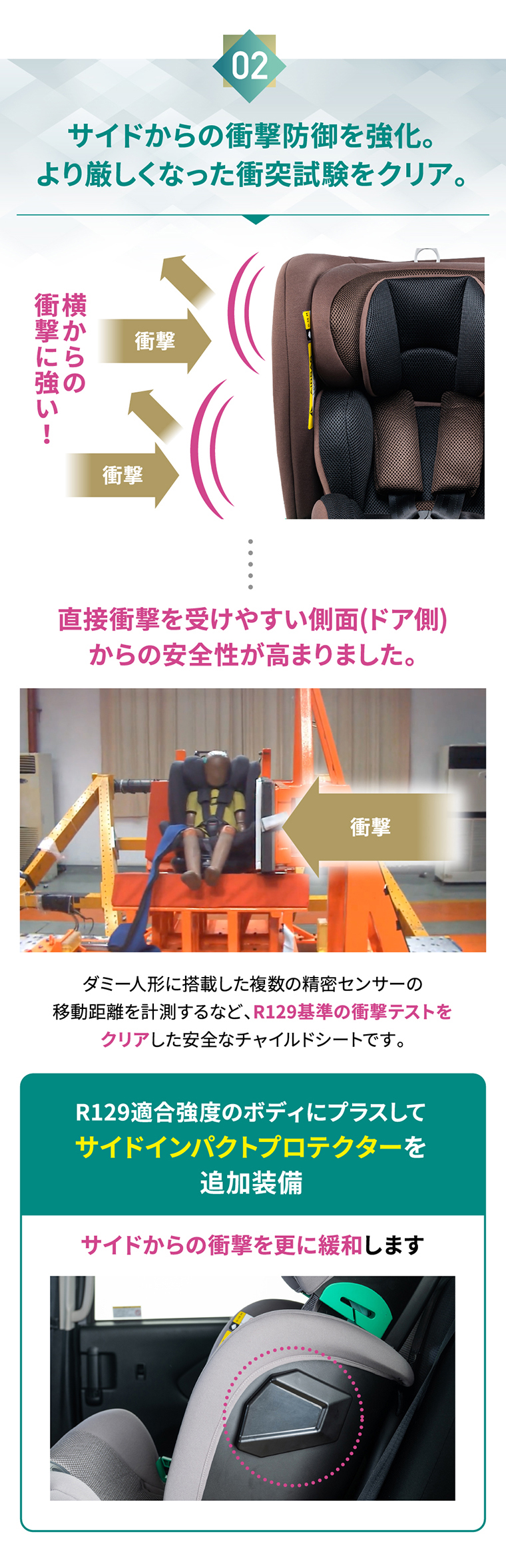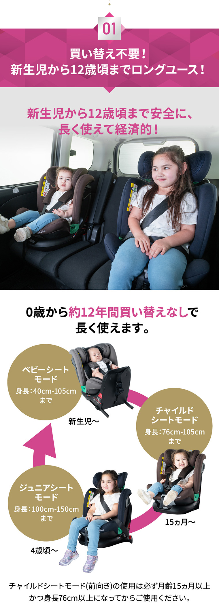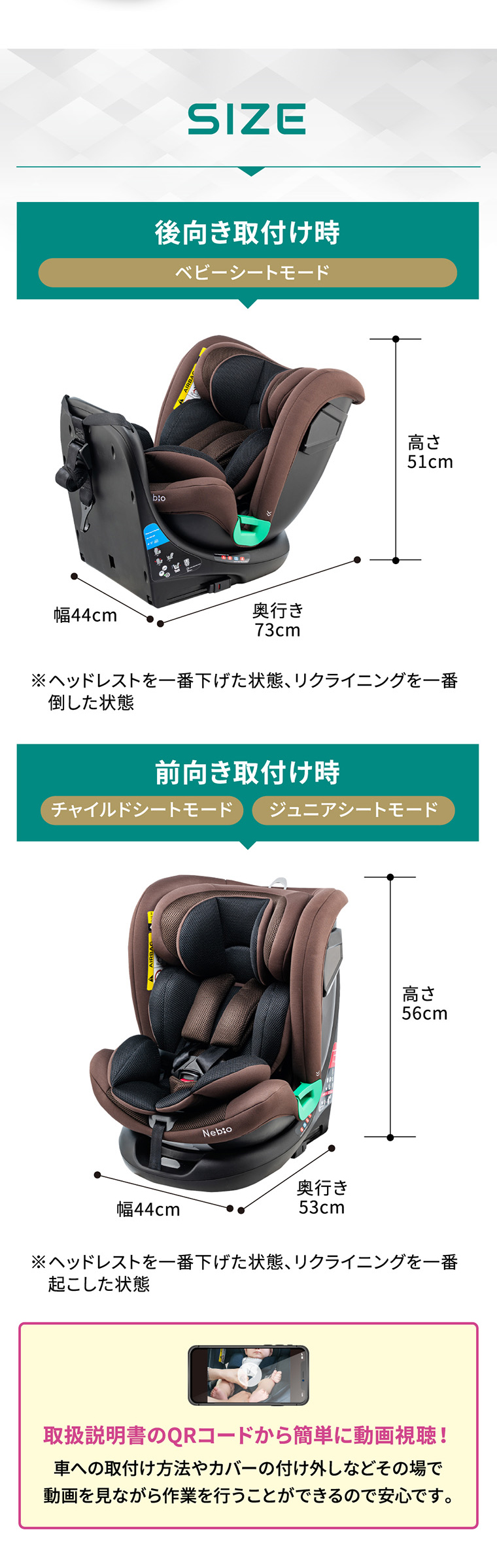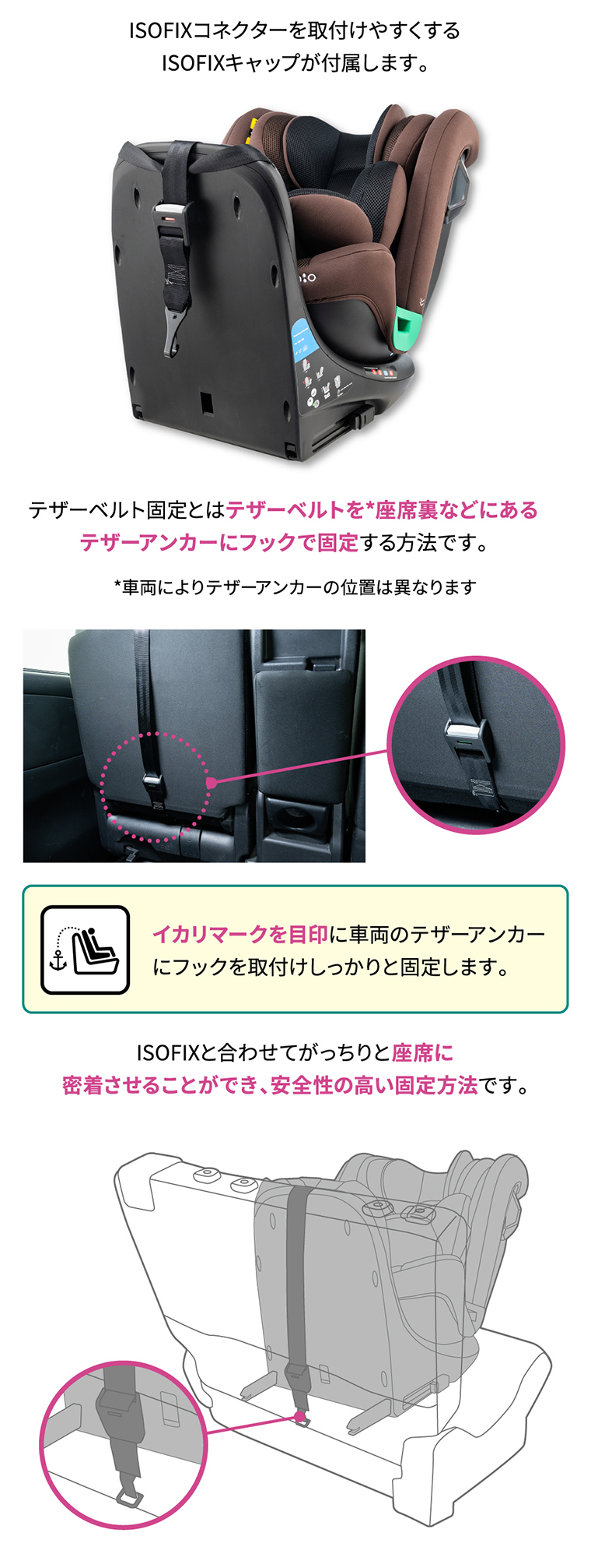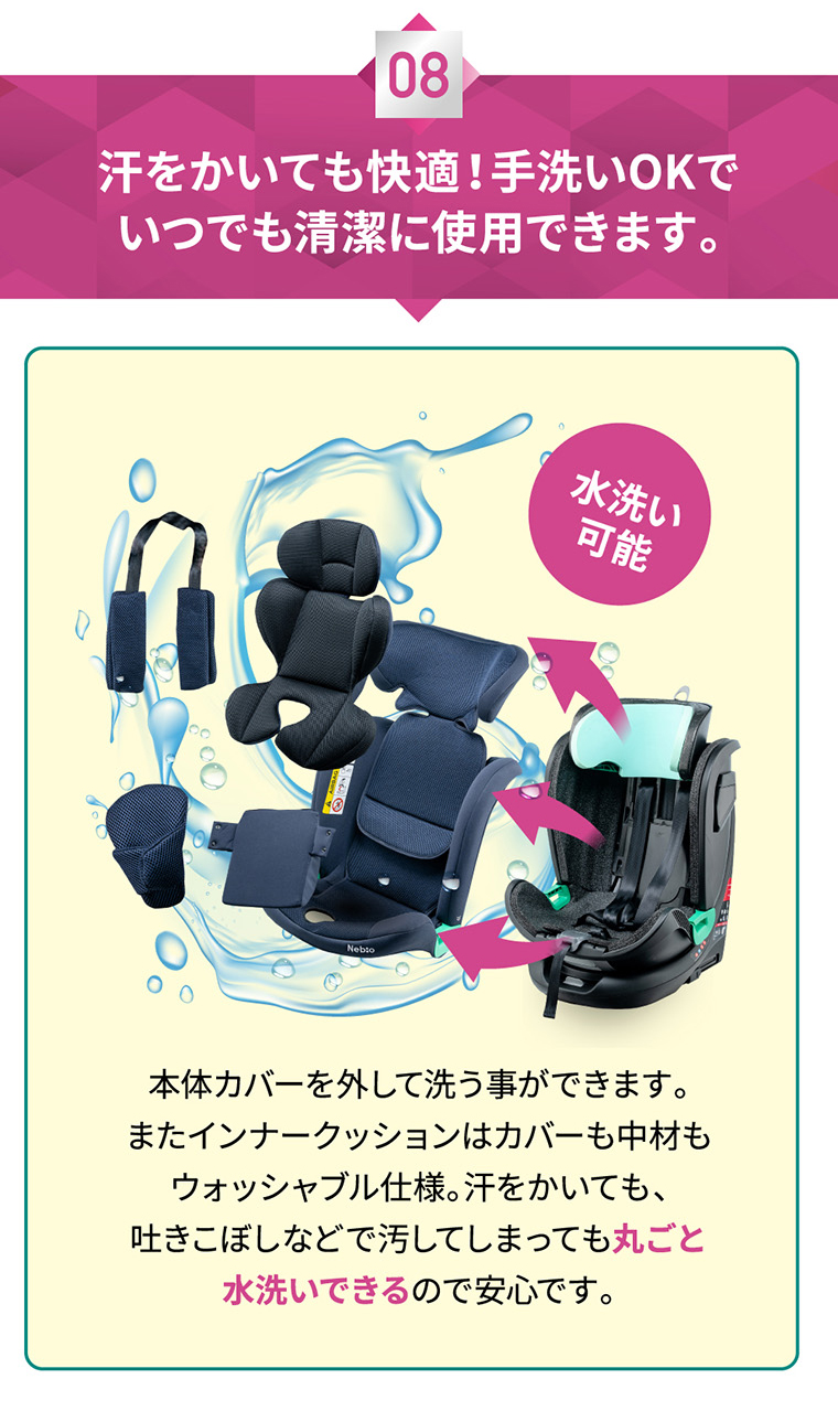 ・ISOFIX+テザーベルトで足下広々 ・360°回転で乗せ降ろしラクラク ・大きなL字台座(リバウンドバー)で衝撃に強く、回転の際も座席に干渉しない ・回転時、テザーベルトの締め直し不要!邪魔にならずストレスフリー ・お子さまを360°守るワイドサポート ・赤ちゃんを包み込むインナーサポート ・R129適合 ・シートカバーを取り外し、水洗い可能 ・簡単ヘッドレスト・肩ベルト調節