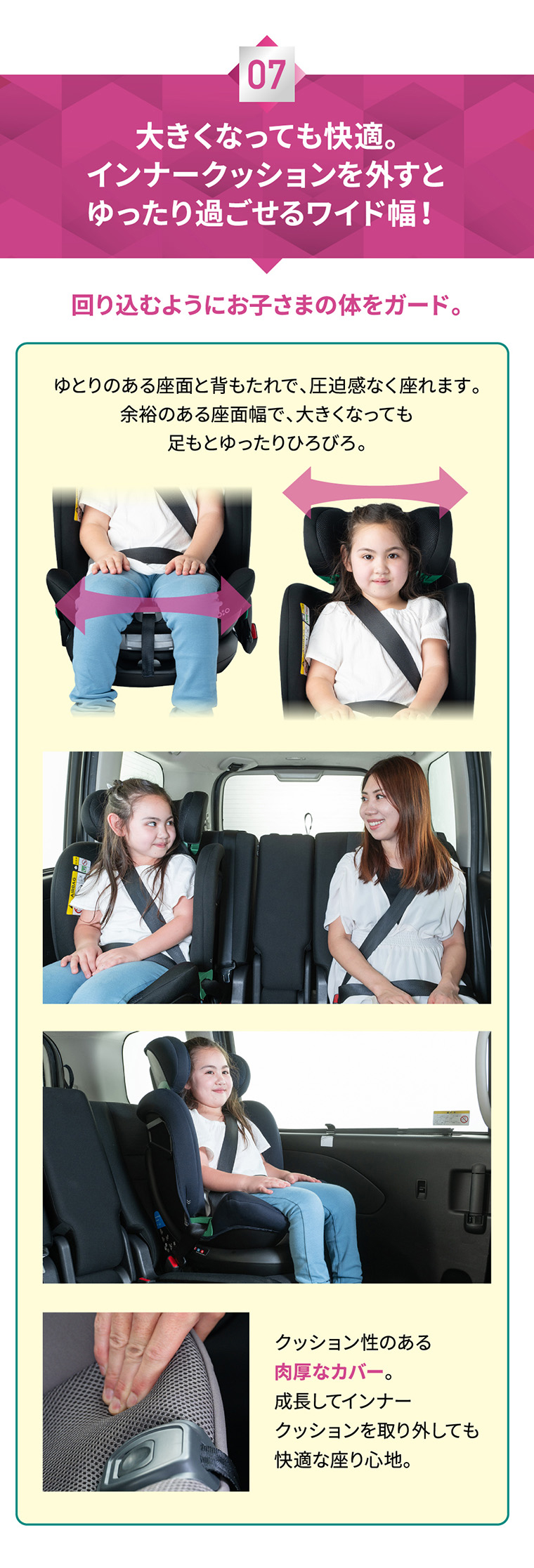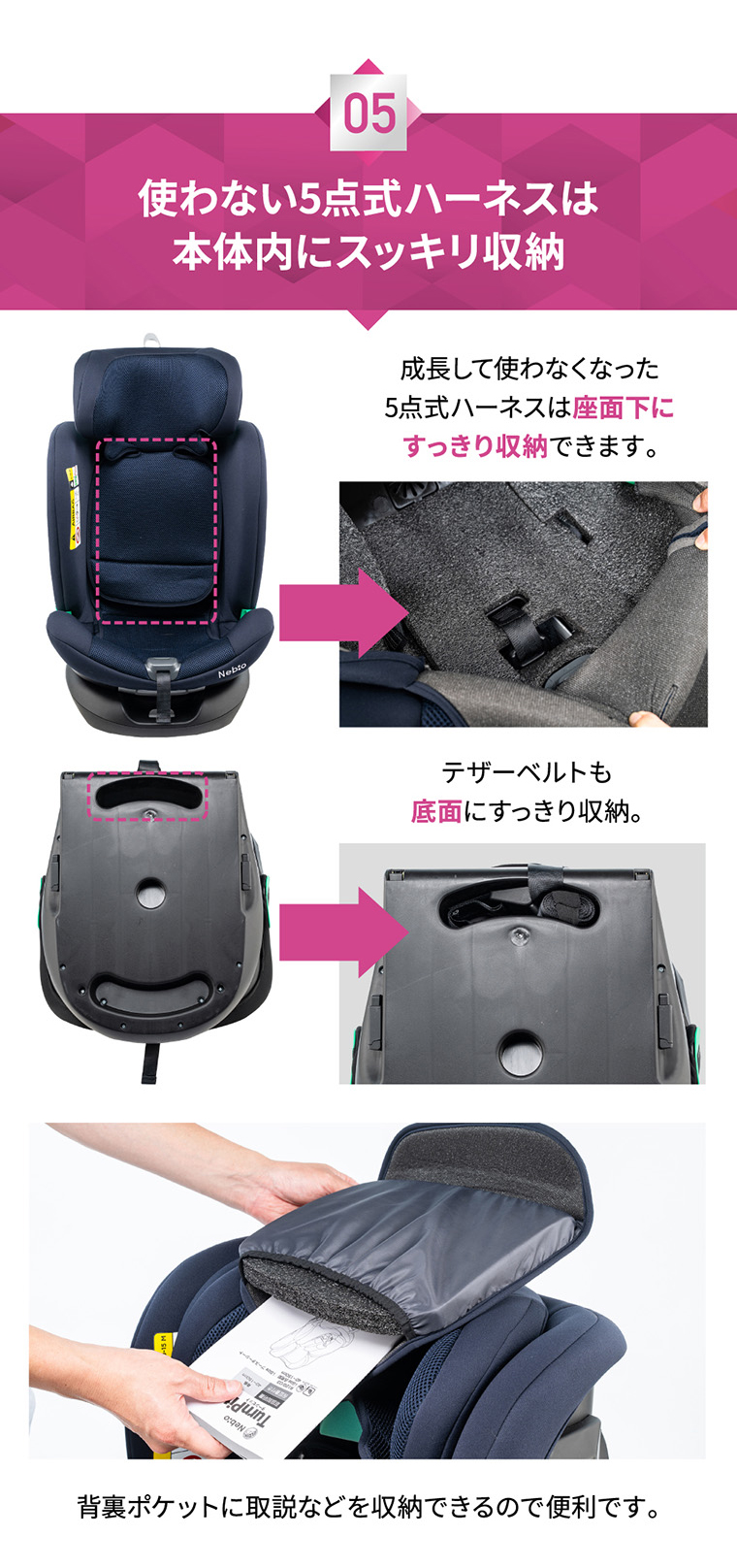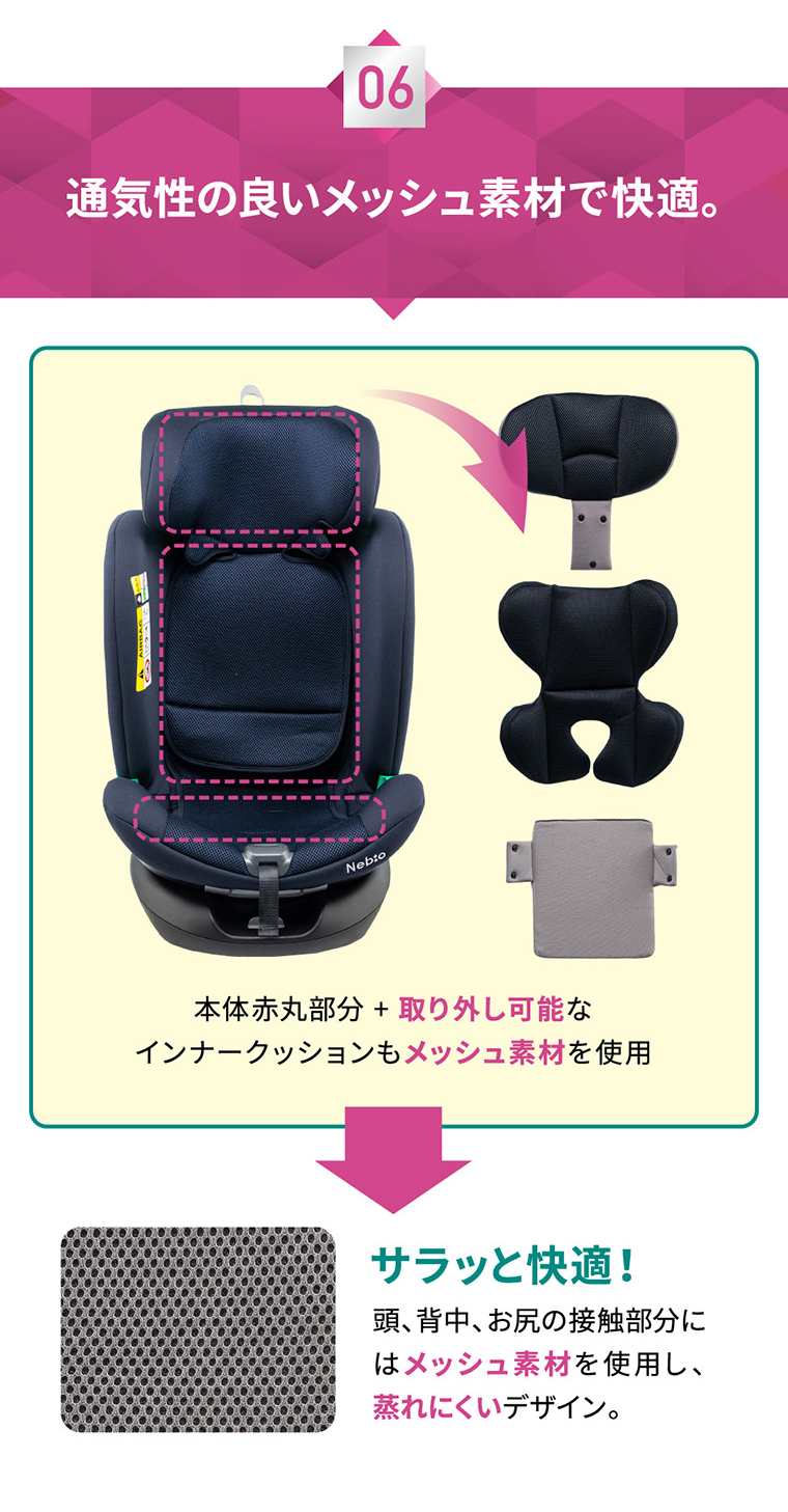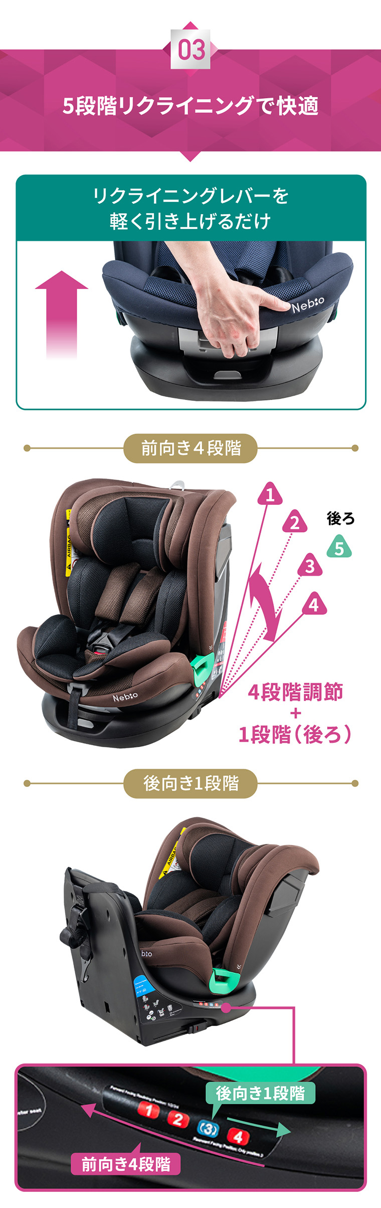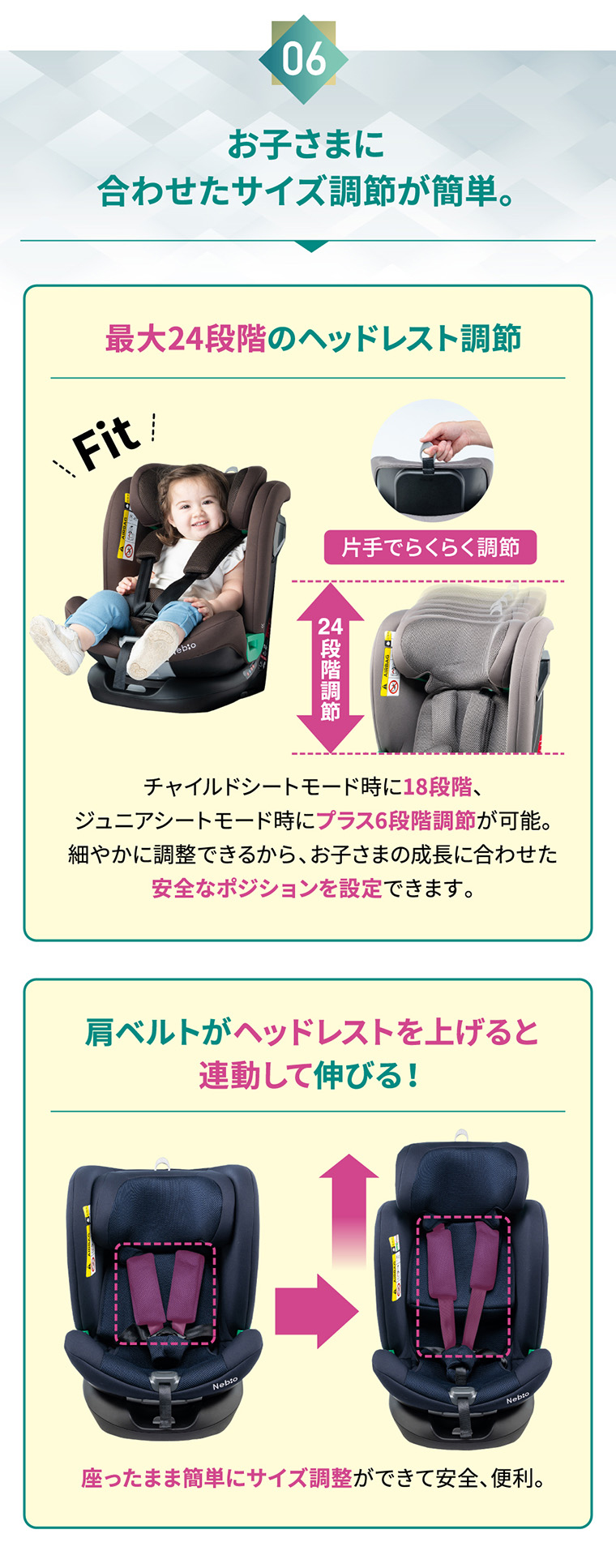 ・ISOFIX+テザーベルトで足下広々 ・360°回転で乗せ降ろしラクラク ・大きなL字台座(リバウンドバー)で衝撃に強く、回転の際も座席に干渉しない ・回転時、テザーベルトの締め直し不要!邪魔にならずストレスフリー ・お子さまを360°守るワイドサポート ・赤ちゃんを包み込むインナーサポート ・R129適合 ・シートカバーを取り外し、水洗い可能 ・簡単ヘッドレスト・肩ベルト調節
