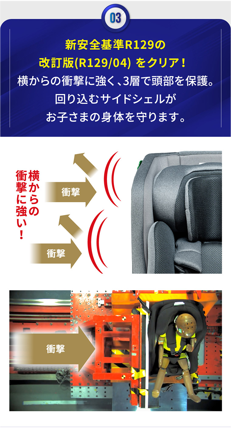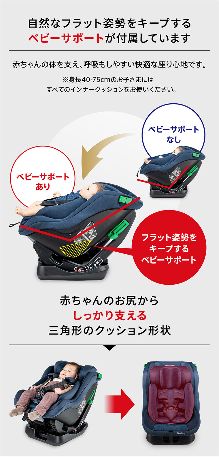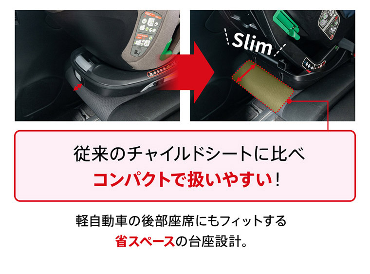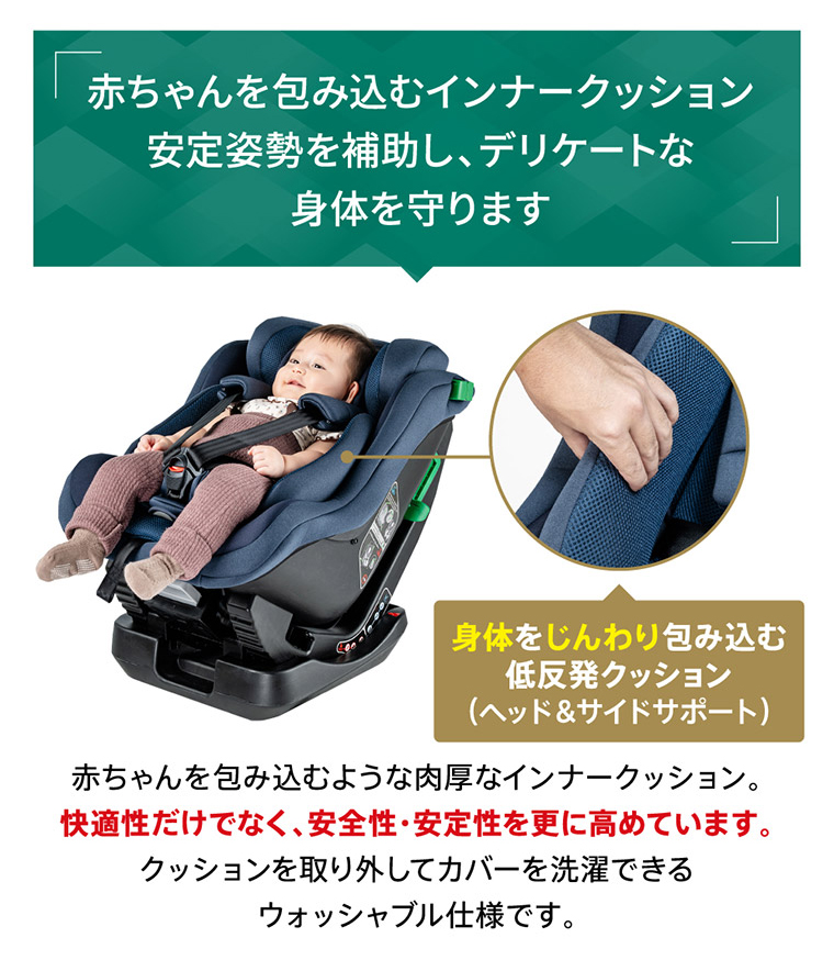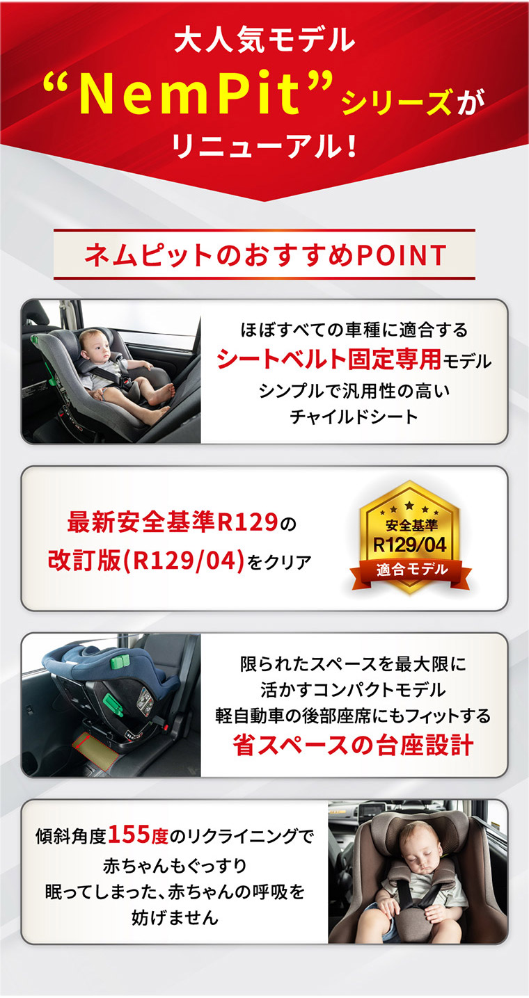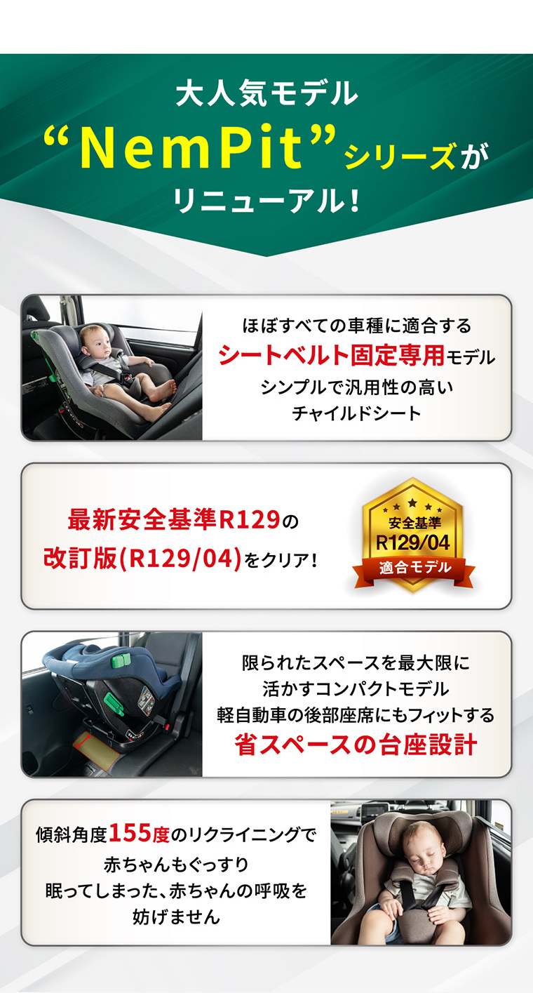 ネムピットG チャイルドシート ■最新安全基準R129の改訂版(R129/04)をクリアした安心のチャイルドシート。 ■傾斜角度155度のリクライニングで赤ちゃんもぐっすり。 ■ほぼすべての車種に適合するシートベルト固定専用モデル。 ■セカンドカーや帰省時などの付け替えに便利なシンプルで汎用性の高いモデル ■新生児から4歳頃まで、成長に合わせて前向き、後ろ向きに取り付けできて長く使えます。 ■軽自動車の後部座席にもフィットする省スペースのコンパクト台座設計