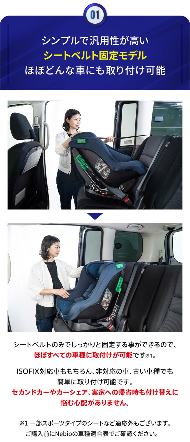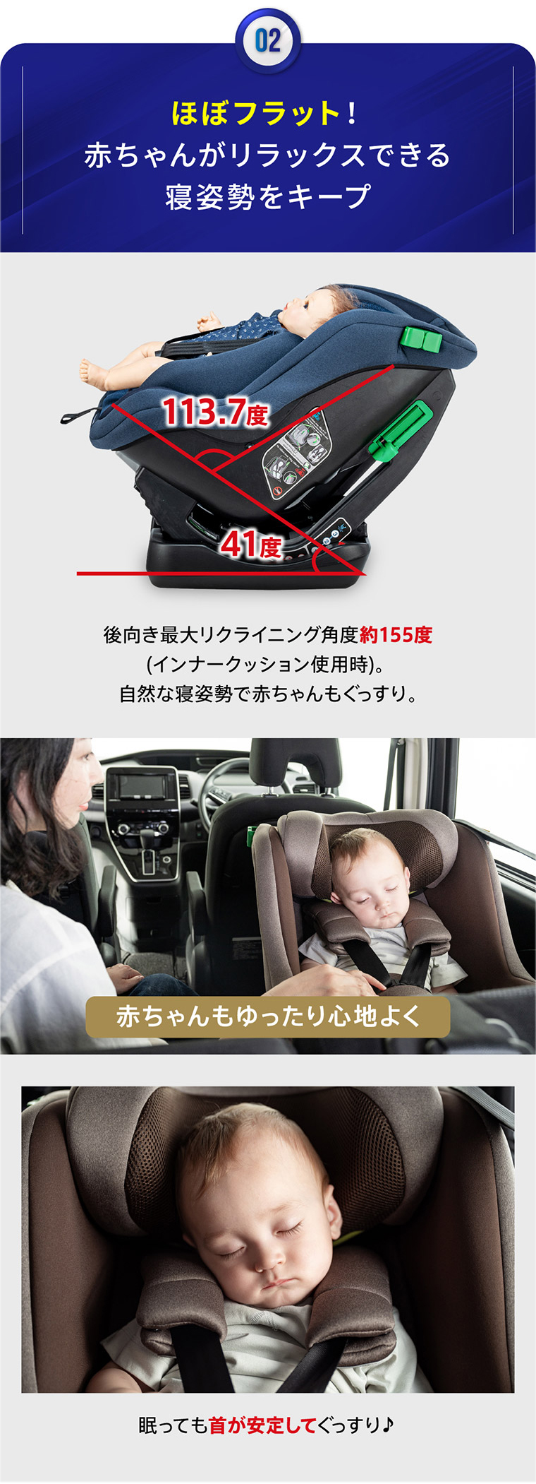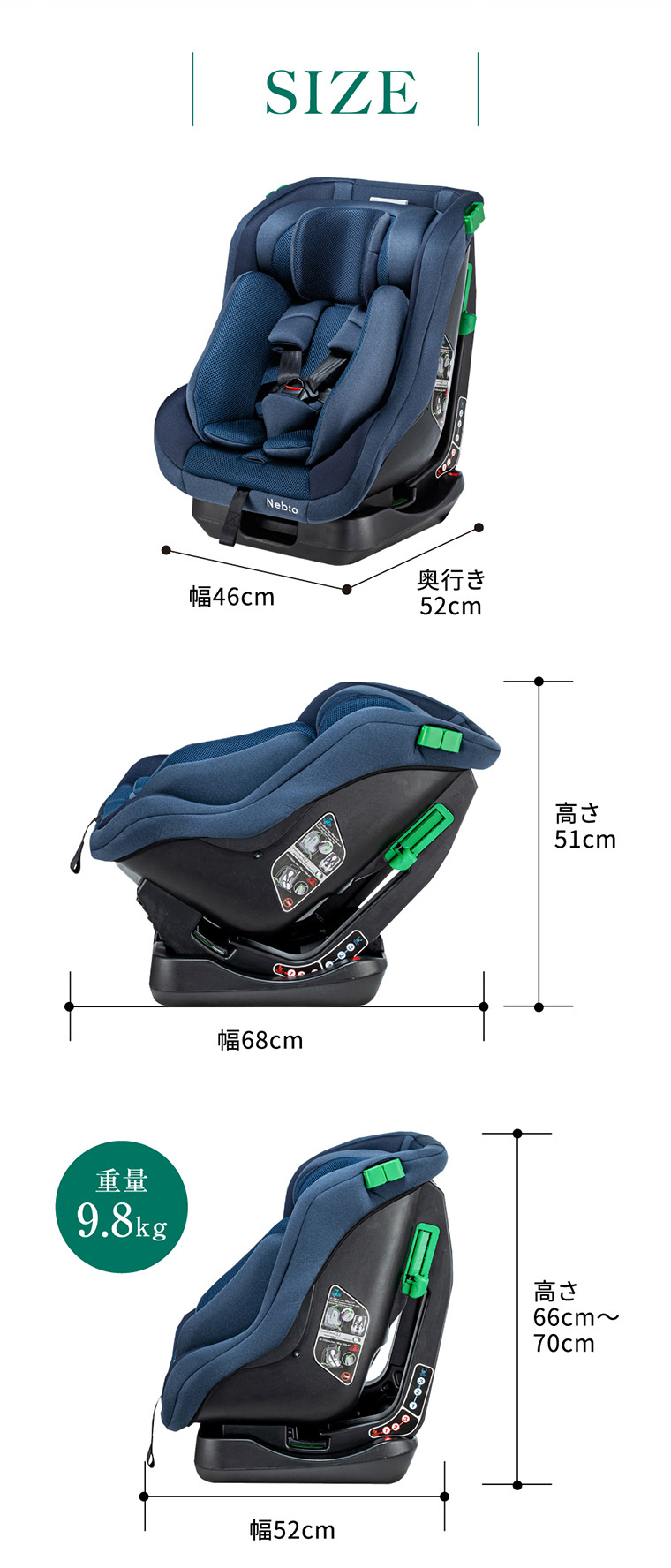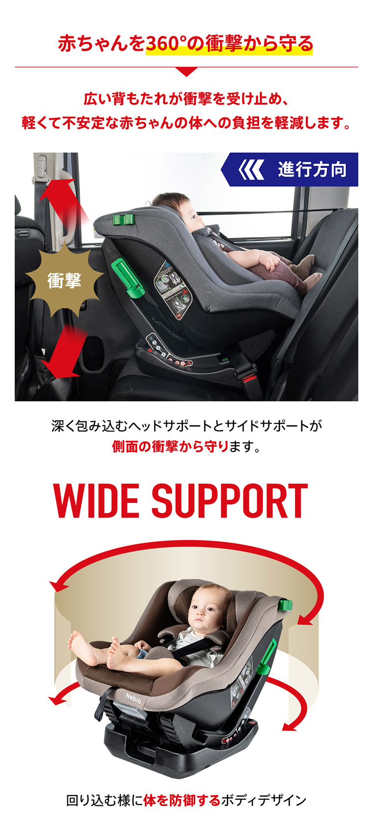 ネムピットG チャイルドシート ■最新安全基準R129の改訂版(R129/04)をクリアした安心のチャイルドシート。 ■傾斜角度155度のリクライニングで赤ちゃんもぐっすり。 ■ほぼすべての車種に適合するシートベルト固定専用モデル。 ■セカンドカーや帰省時などの付け替えに便利なシンプルで汎用性の高いモデル ■新生児から4歳頃まで、成長に合わせて前向き、後ろ向きに取り付けできて長く使えます。 ■軽自動車の後部座席にもフィットする省スペースのコンパクト台座設計