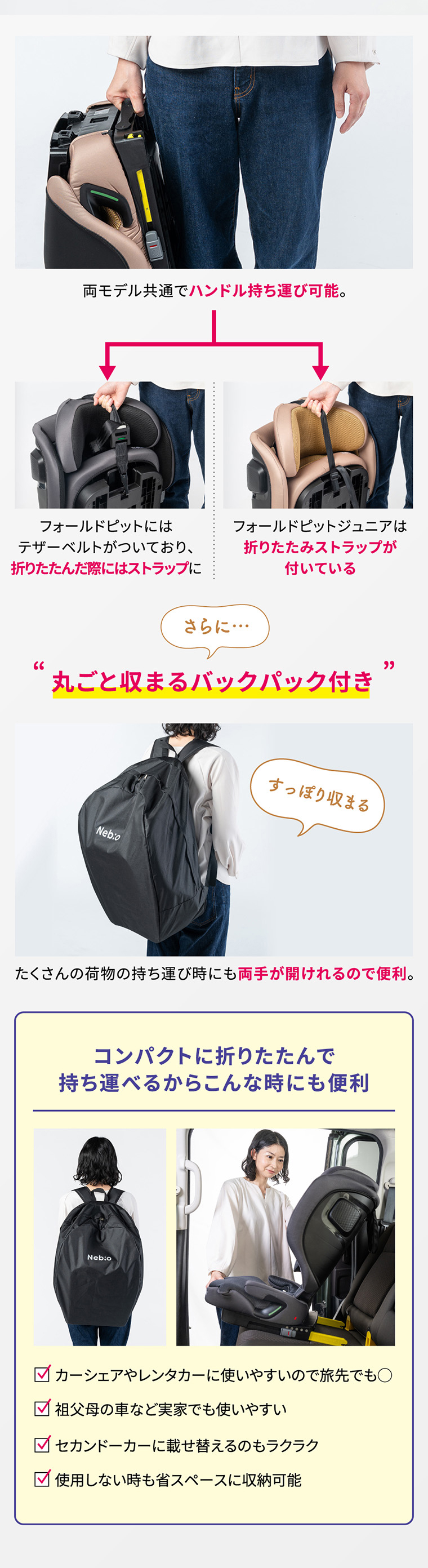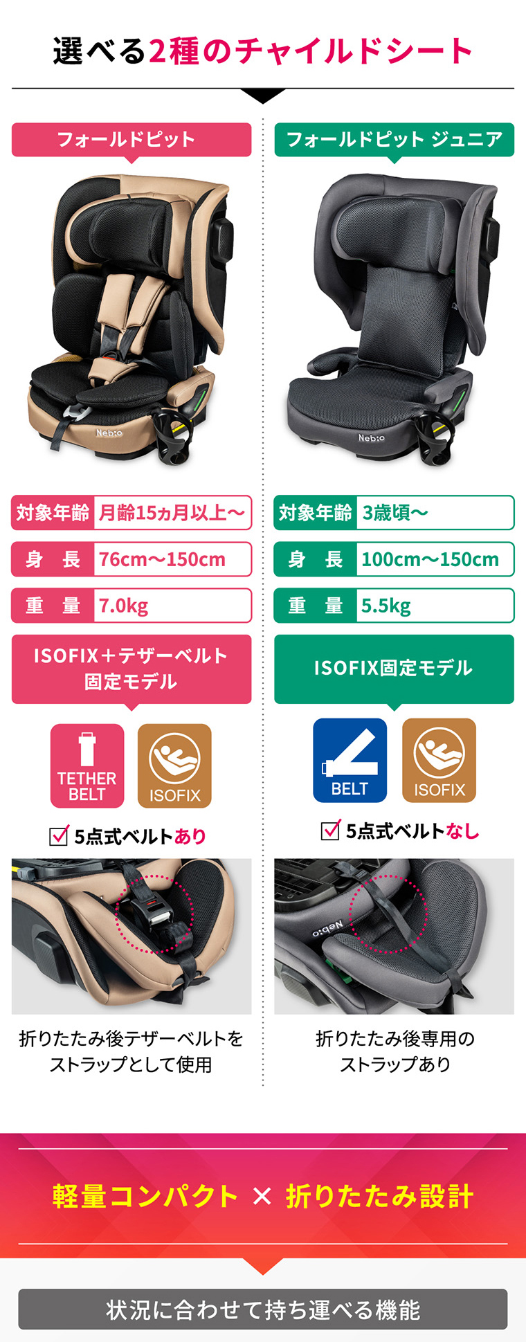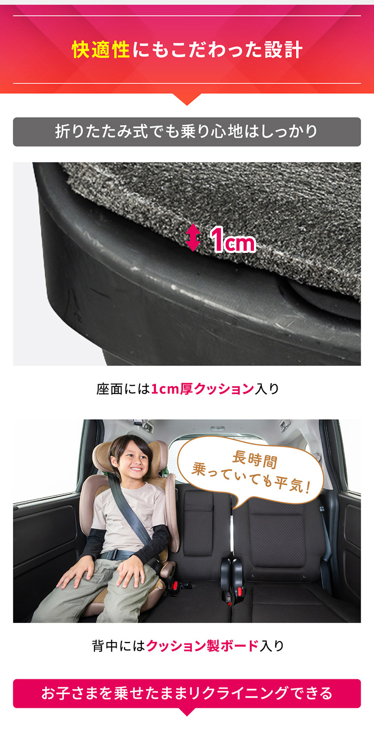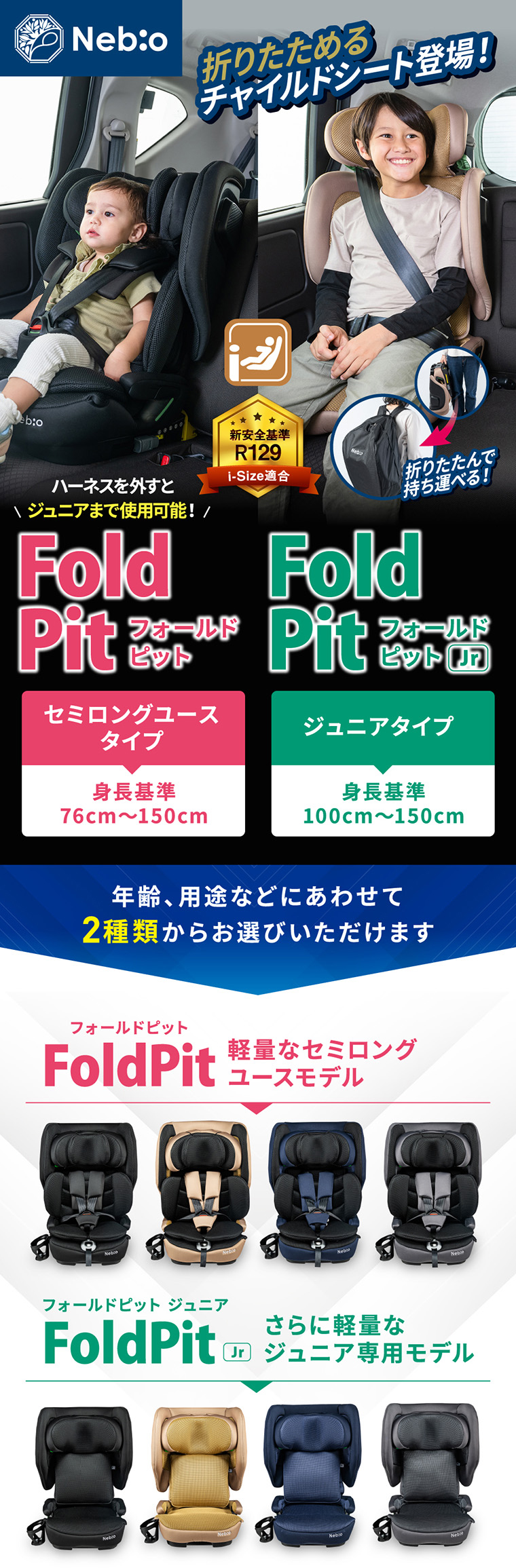 フォールドピット ・折りたためて、軽量+コンパクトで持ち運びラクラク ・バックパックタイプの専用バッグ付き ・ISOFIX固定で付け替えスムーズ ・R129適合 ・シートカバーを取り外し、水洗い可能 ・簡単ヘッドレスト・肩ベルト調節