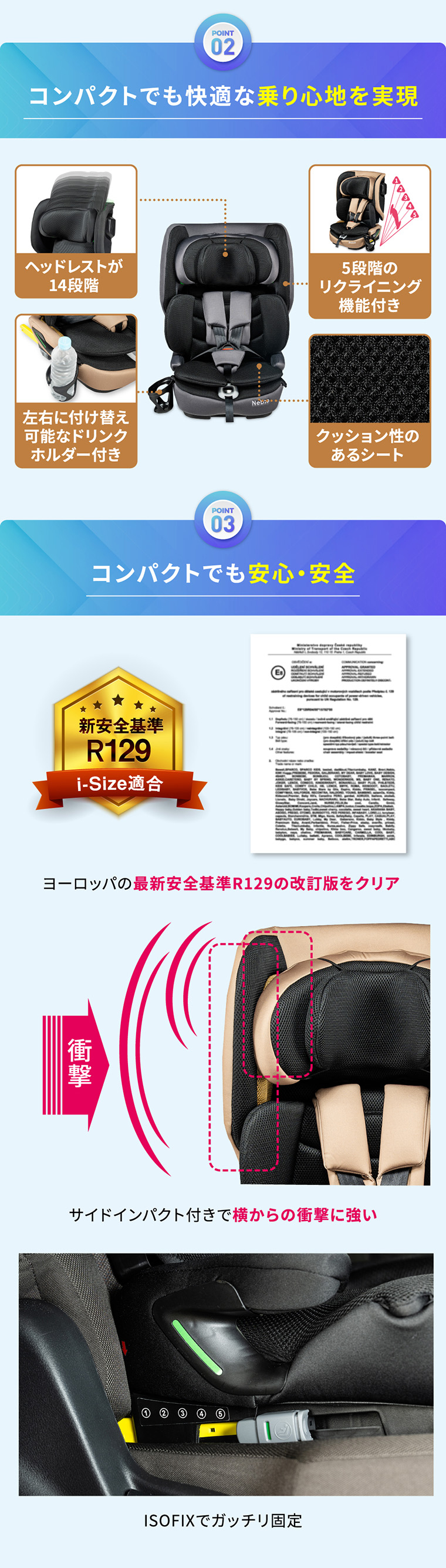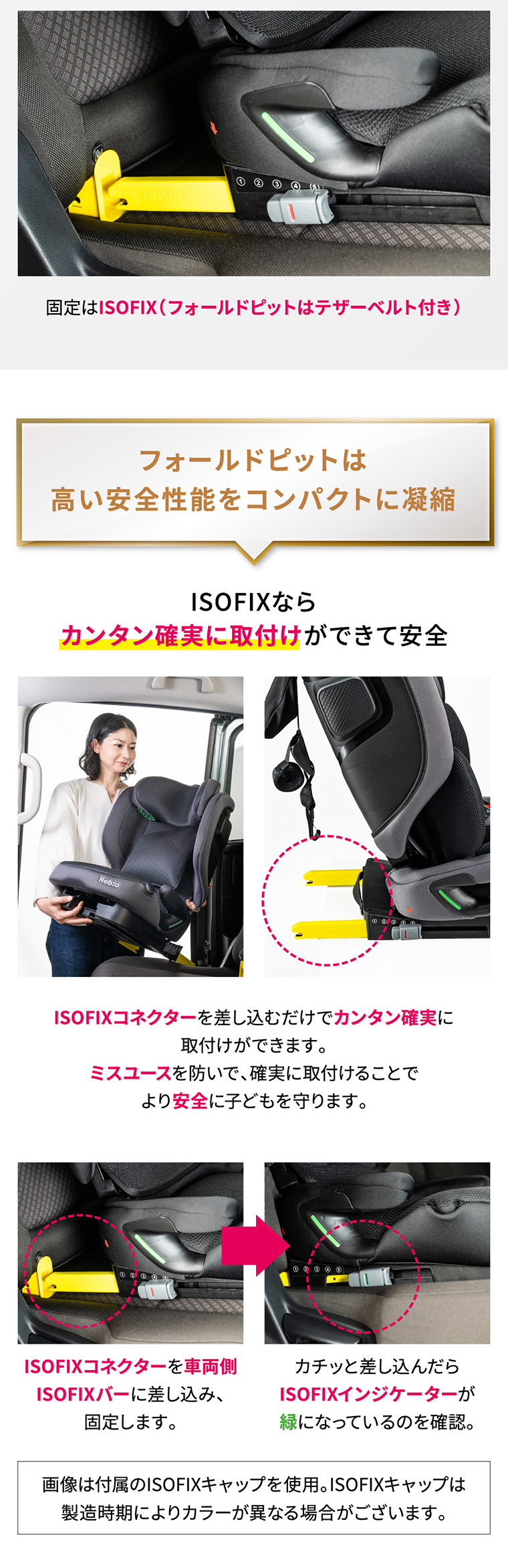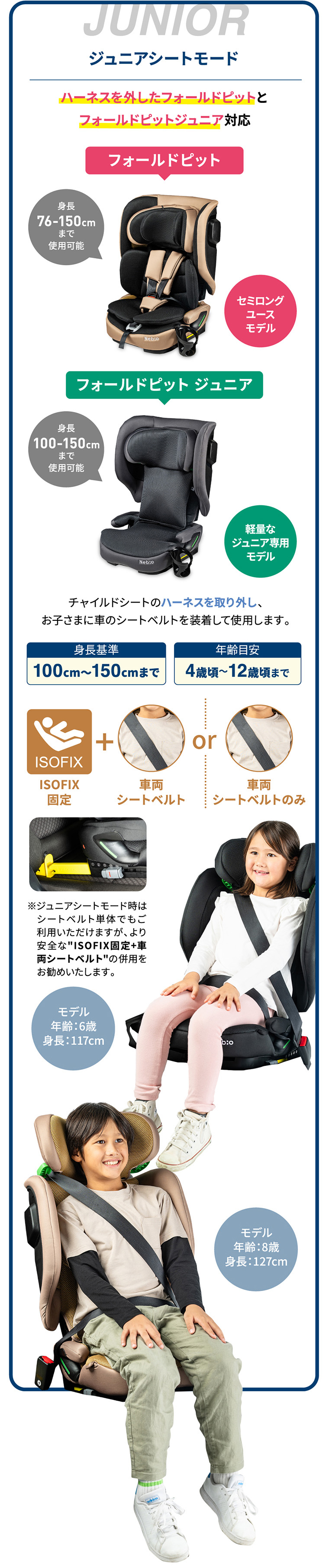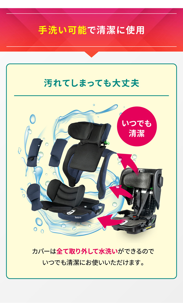 フォールドピット ・折りたためて、軽量+コンパクトで持ち運びラクラク ・バックパックタイプの専用バッグ付き ・ISOFIX固定で付け替えスムーズ ・R129適合 ・シートカバーを取り外し、水洗い可能 ・簡単ヘッドレスト・肩ベルト調節