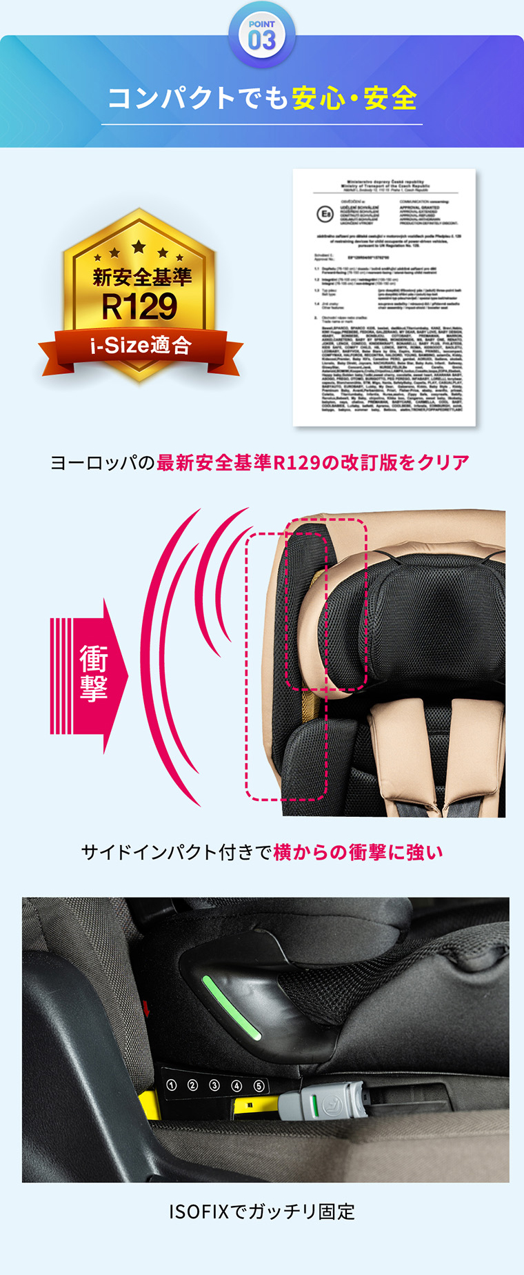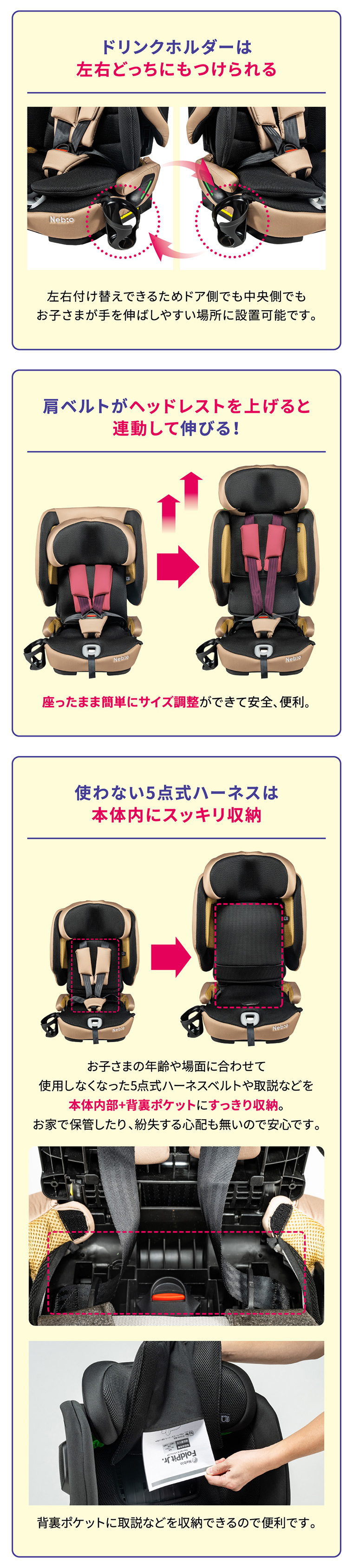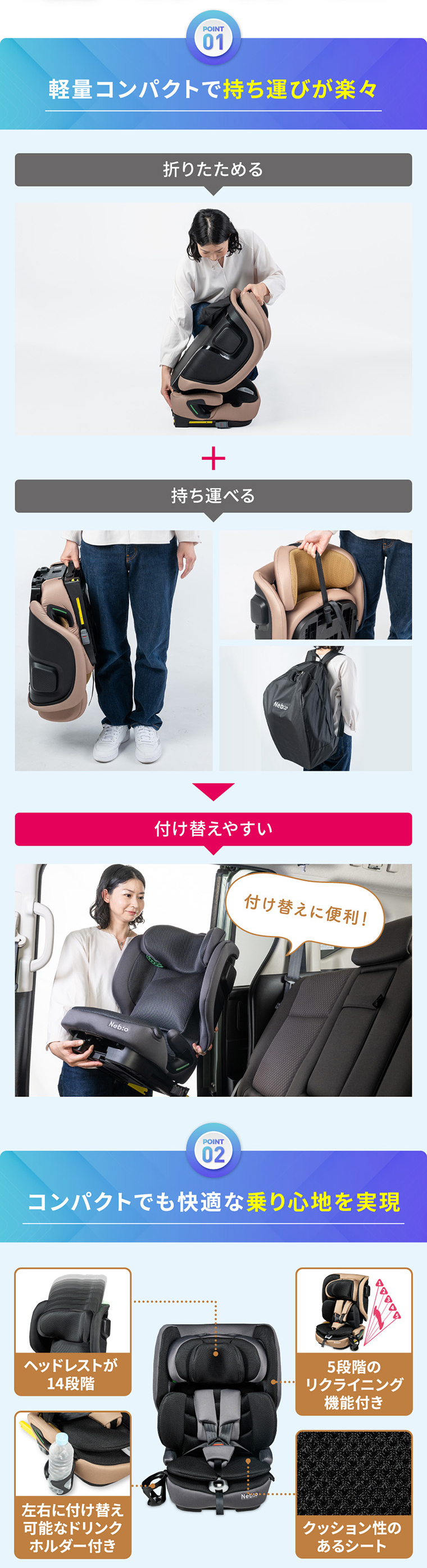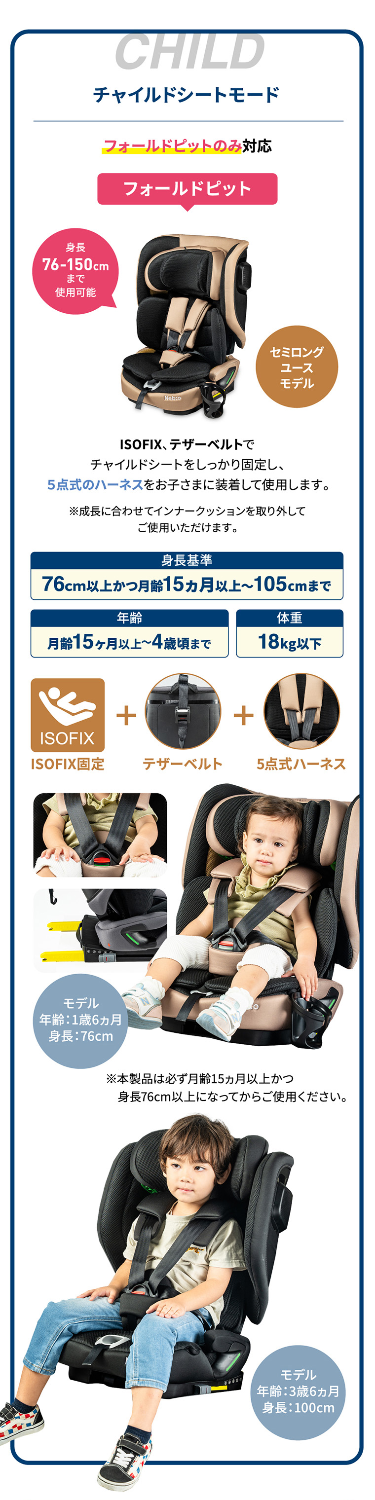 フォールドピット ・折りたためて、軽量+コンパクトで持ち運びラクラク ・バックパックタイプの専用バッグ付き ・ISOFIX固定で付け替えスムーズ ・R129適合 ・シートカバーを取り外し、水洗い可能 ・簡単ヘッドレスト・肩ベルト調節