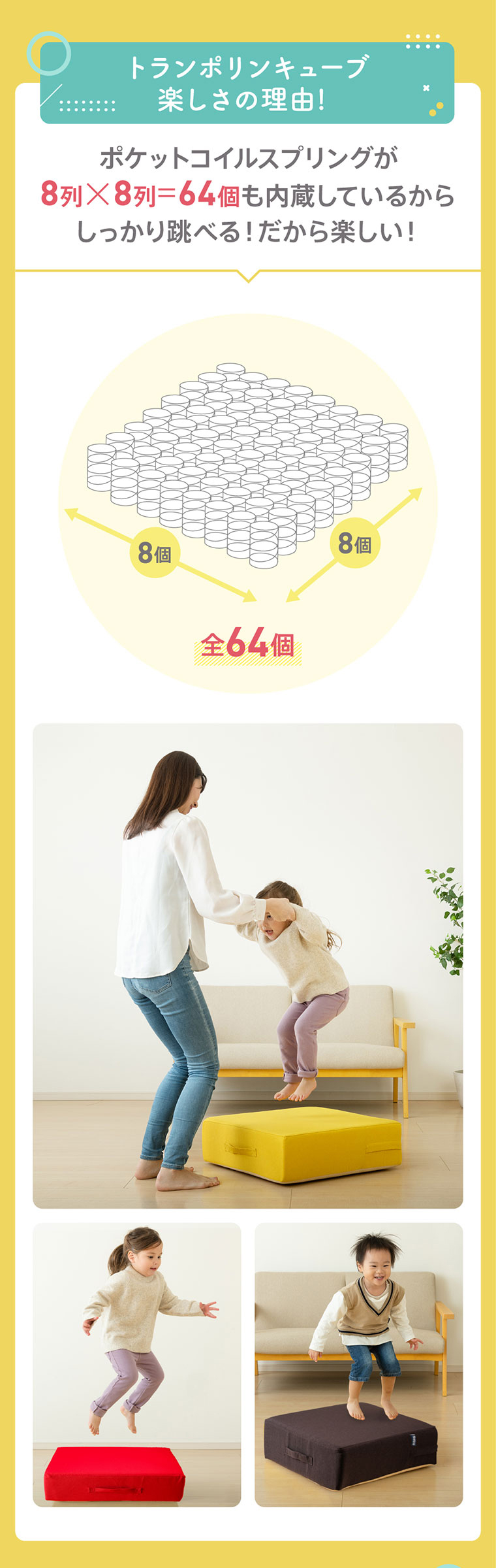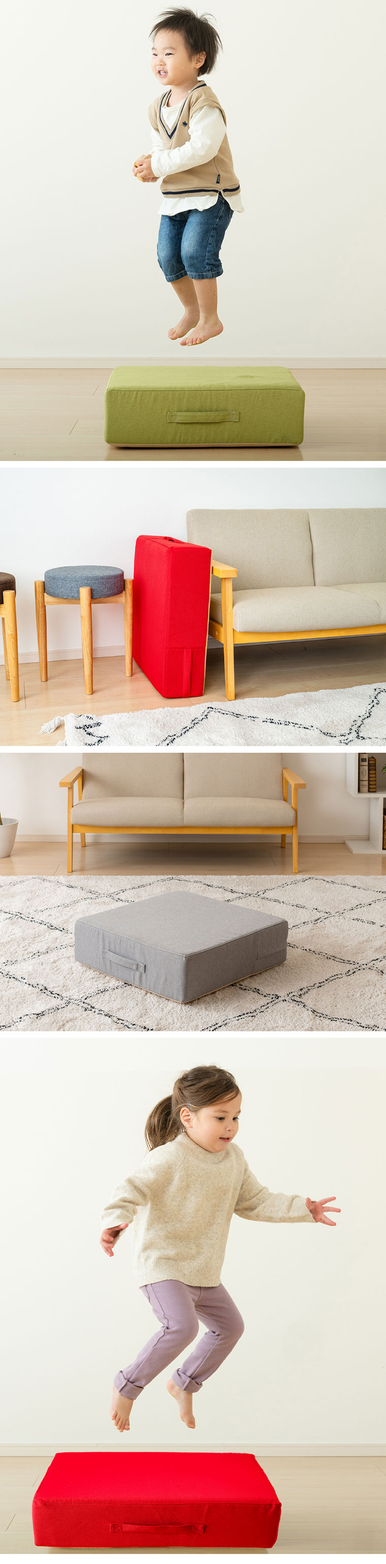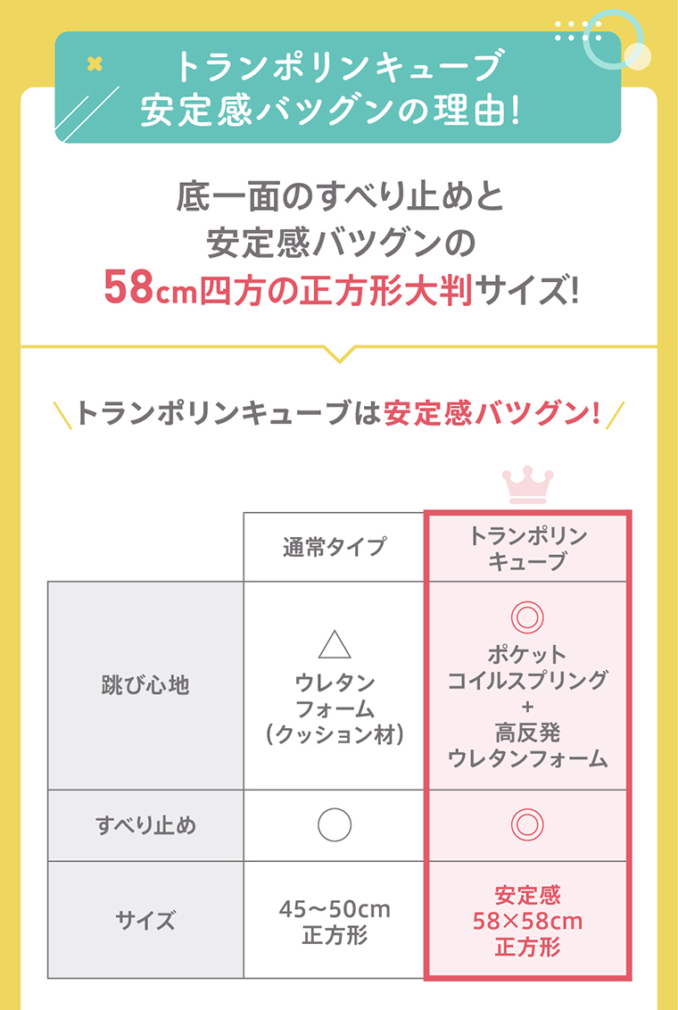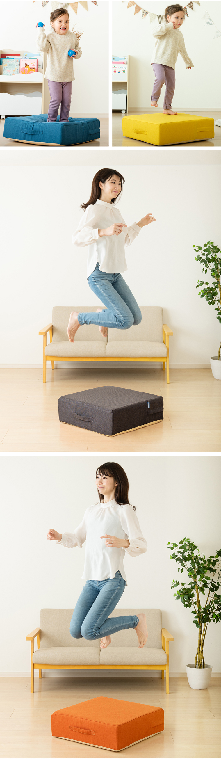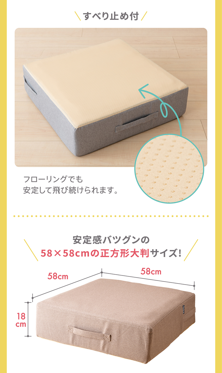 ・ポケットコイルスプリングを64個内蔵&高反発ウレタンフォームを使用しているから、しっかり飛べる!だから楽しい! ・58cmと大判の正方形&すべり止めで安定感バツグン! ・オットマンやインテリアとしてもおしゃれに使用できます。 ・カバーは手洗いOKだからいつでも清潔! ・重量3.1kgの軽量+取っ手付きで移動も楽々。
