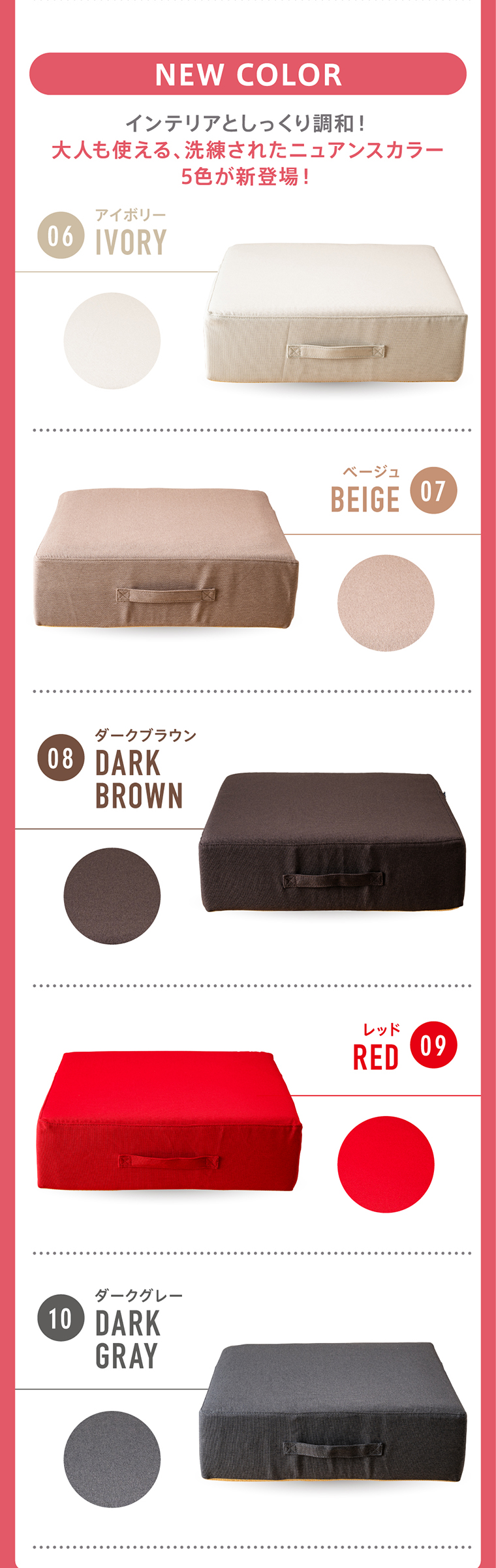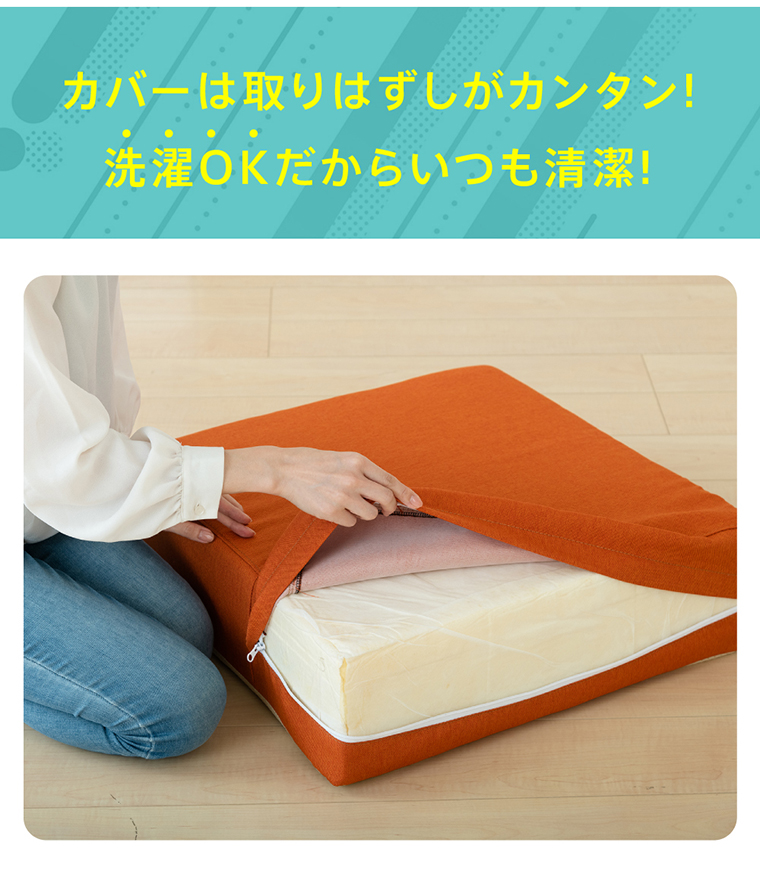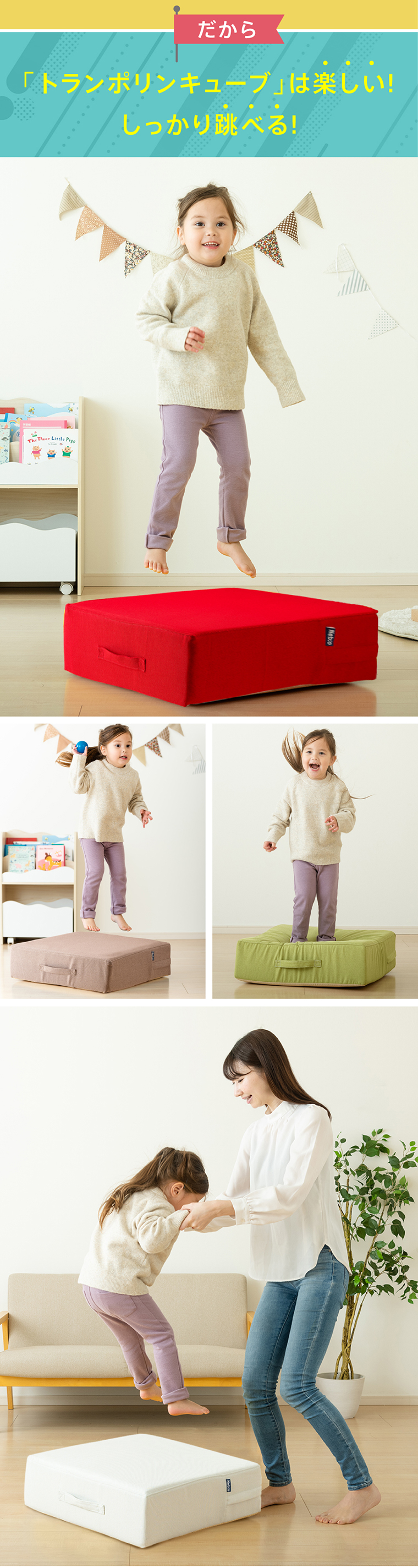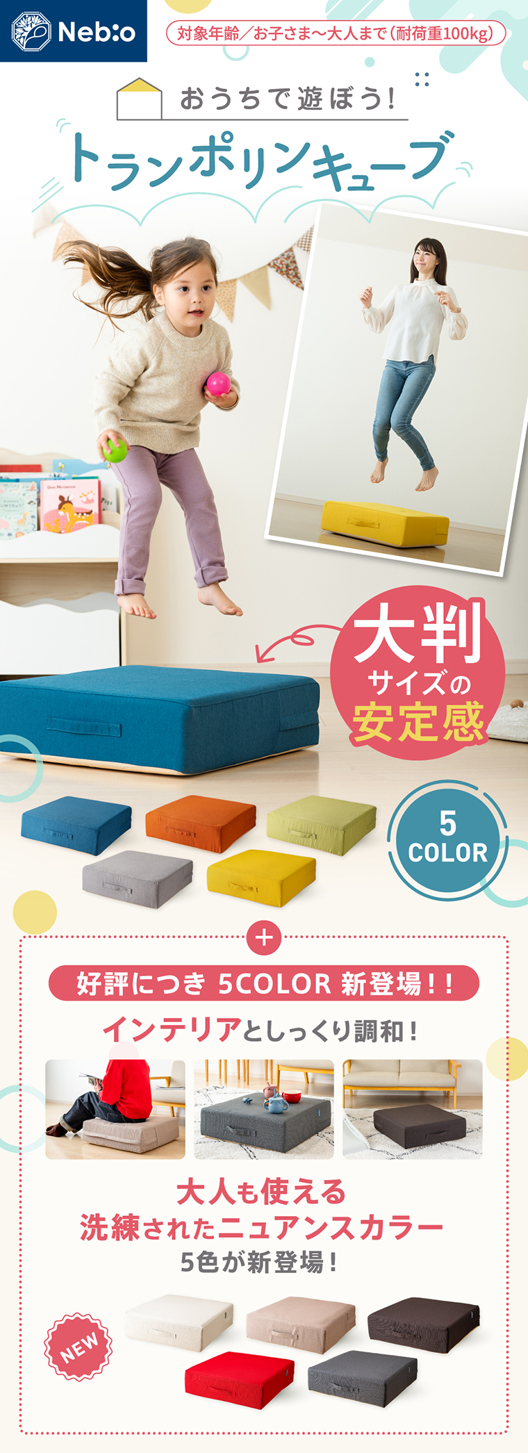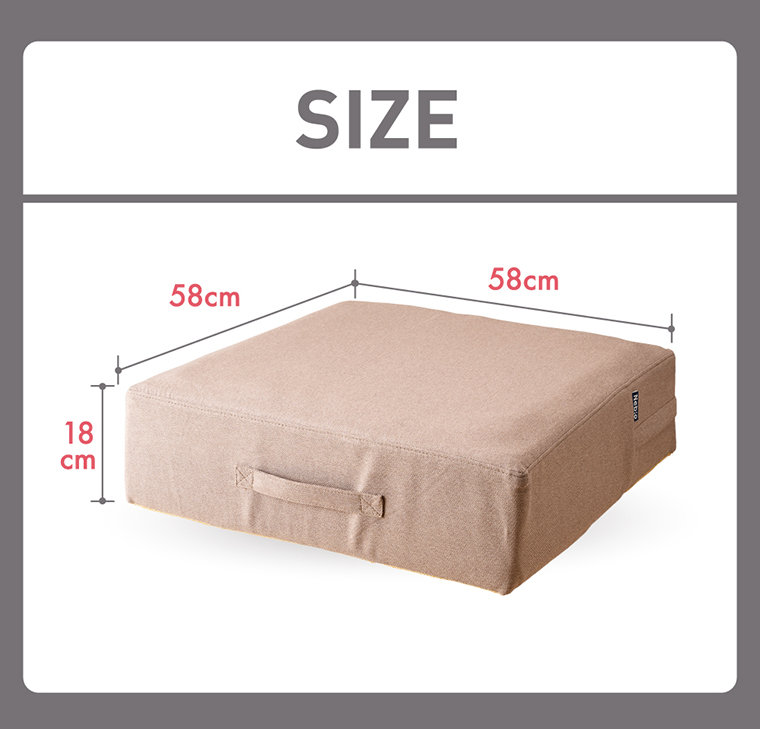 ・ポケットコイルスプリングを64個内蔵&高反発ウレタンフォームを使用しているから、しっかり飛べる!だから楽しい! ・58cmと大判の正方形&すべり止めで安定感バツグン! ・オットマンやインテリアとしてもおしゃれに使用できます。 ・カバーは手洗いOKだからいつでも清潔! ・重量3.1kgの軽量+取っ手付きで移動も楽々。