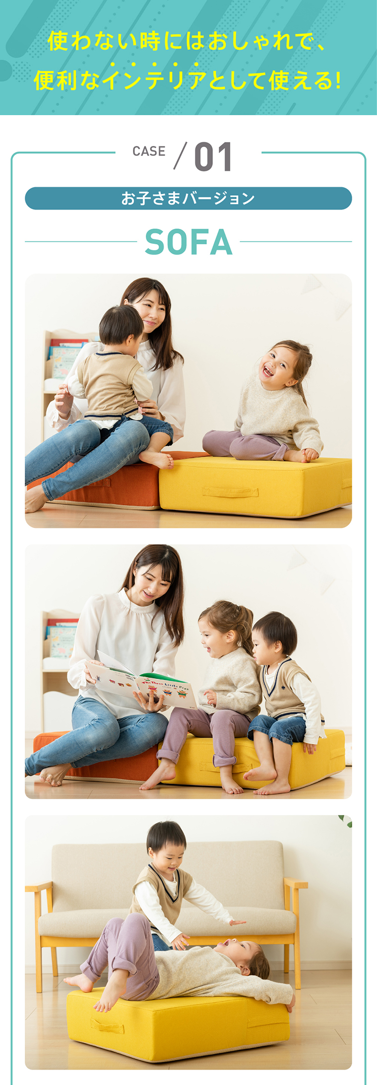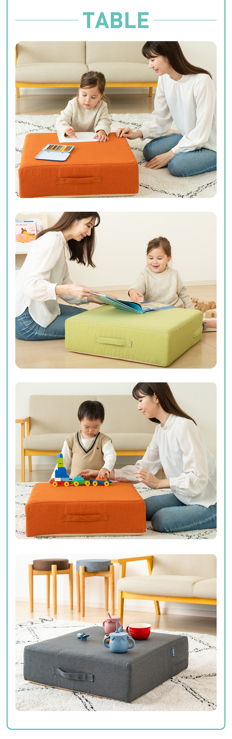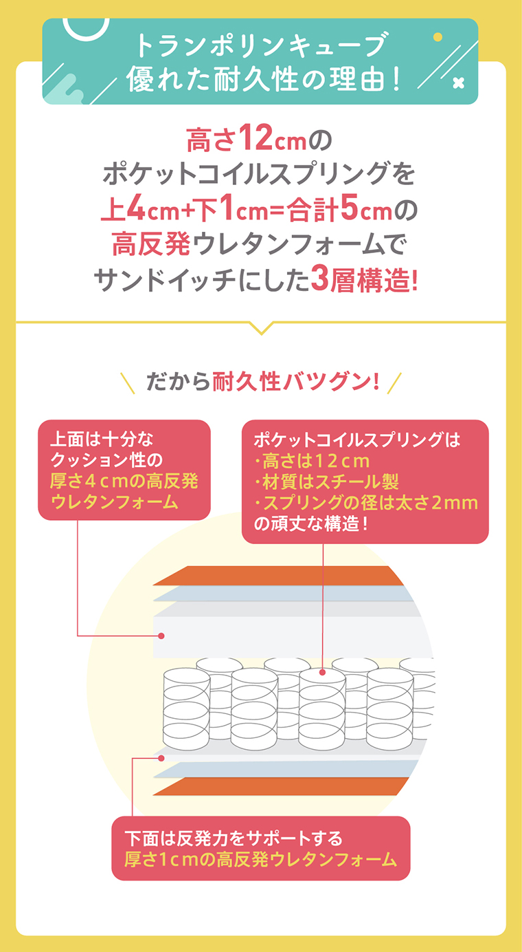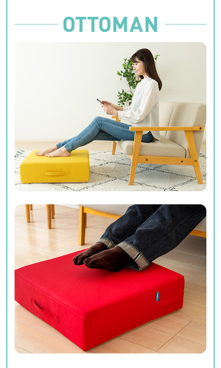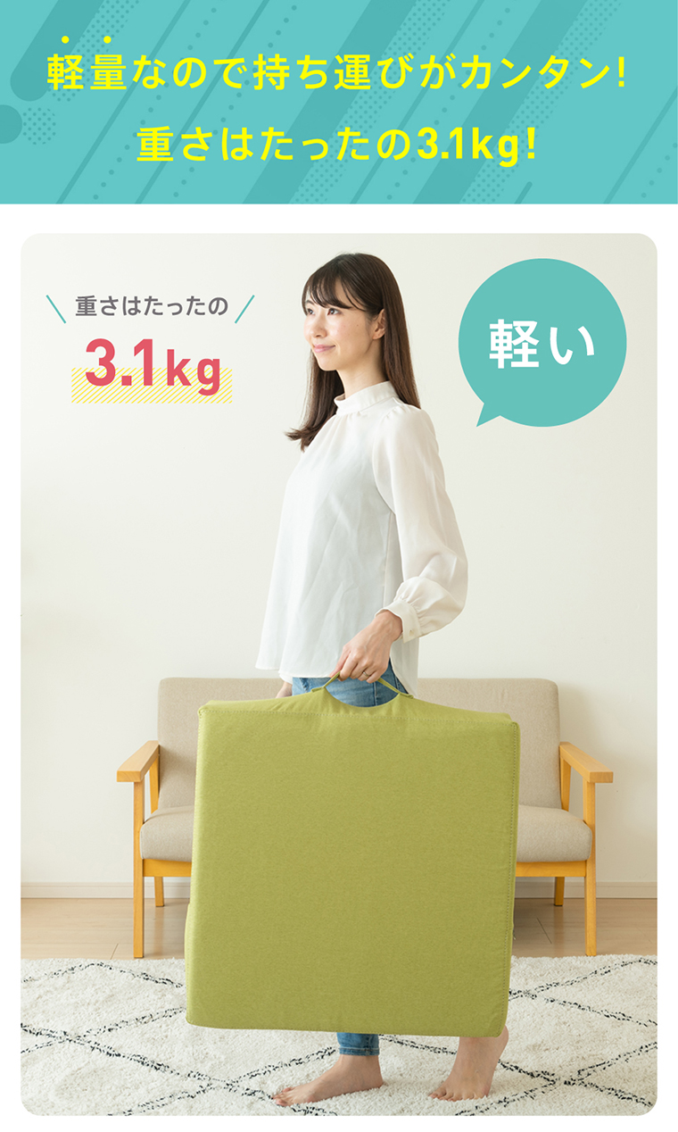 ・ポケットコイルスプリングを64個内蔵&高反発ウレタンフォームを使用しているから、しっかり飛べる!だから楽しい! ・58cmと大判の正方形&すべり止めで安定感バツグン! ・オットマンやインテリアとしてもおしゃれに使用できます。 ・カバーは手洗いOKだからいつでも清潔! ・重量3.1kgの軽量+取っ手付きで移動も楽々。